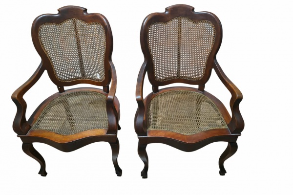 • MOBILIÁRIO, par (2) de cadeiras de braços em madeira maciça de tonalidade castanho médio, com encosto e assento em palhinha natural trançada, espaldar recortado em linhas curvas, braços arqueados e pernas em suave movimento, remetendo ao estilo clássico europeu. Peças firmes e estruturadas, com pátina do tempo e leves sinais de uso compatíveis com a idade. 1 possui desgaste na palinha, medindo 90x60x56cm.