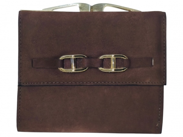 • <b>ACESSÓRIO FEMININO</b>, uma (1) carteira confeccionada em camurça na tonalidade marrom, guarnições e fecho superior em metal dourado, em bom estado de conservação, medindo 9x11cm.