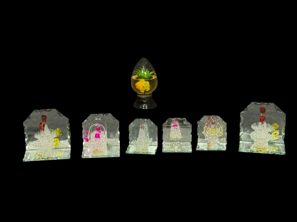 • <B>MURANOS</b>, lote com seis (6) peças decorativas confeccionadas em vidro de Murano de modelos, tamanhos e decorações distintas, apoiadas sobre placas espelhadas com recortes na borda, medindo 7x7cm e menor 4,5x4,5cm, acompanha um ovo decorativo em vidro com peixe em plástico interno, medindo 8cm de altura.