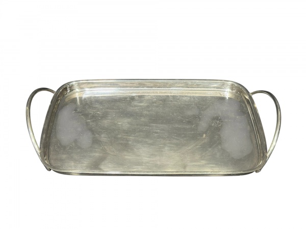 • <b>METAL PRATEADO</b>, uma (1) bandeja retangular confeccionada em metal espessurado a prata da manufatura MERIDIONAL, fundo liso e alças cilíndricas, medindo 35,5x21,5cm.