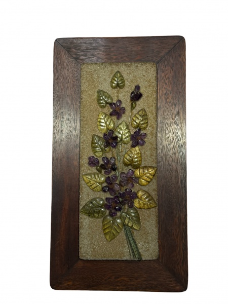 • QUADRO, um (1) painel emoldurado representando flores e folhagens em pedras brasileiras apoiada sobre placa retangular em madeira escura, medindo 47,5x25cm. Assinado no verso.