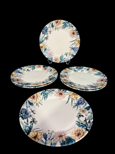 • Porto Brasil (É uma empresa brasileira, com sede e fábrica em Porto Ferreira, no interior de São Paulo), seis (6) pratos rasos confeccionados em faiança nacional vitrificada na tonalidade creme com rica decoração floral em policromia, medindo 26cm de diâmetro.