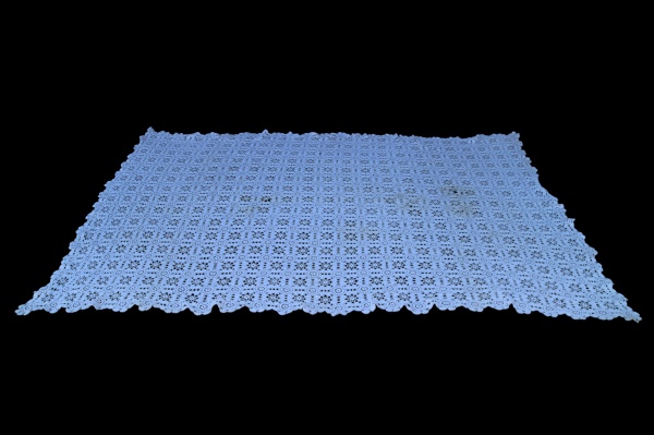 • CAMA, MESA e BANHO, uma (1) colcha para cama de casal confeccionada em crochê decorado por estrelas e bordas em tasseis, marcas de guardado, vide foto, medindo 204x176cm.
