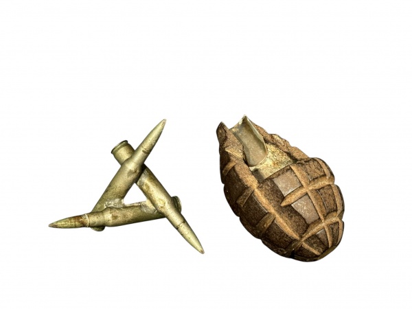 • MILITARIA, conjunto com dois (2) itens de temática militar, composto por um (1) objeto decorativo em formato de granada e um (1) conjunto de projéteis estilizados. Peças confeccionadas em metal, com acabamento patinado, destinadas exclusivamente à decoração ou coleção, sem qualquer funcionalidade, medindo 3,5x7,5x8cm e 5,5x9,5x5,5cm.