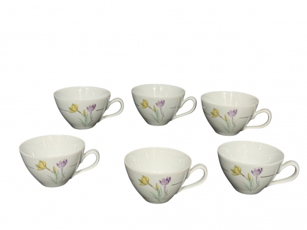 • PORCELANA RENNER, seis (6) xícaras para chá sem pires confeccionadas em porcelana nacional na tonalidade branca decoradas por flores e folhagens em policromia e filete em ouro, medindo 5,5x11x9cm.
