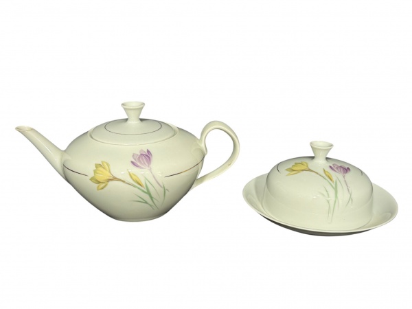 • PORCELANA RENNER, duas (2) peças, sendo: A) 1 bule para chá, medindo 12x24x10cm e B) 1 manteigueira, medindo 8x16cm. confeccionadas em porcelana nacional na tonalidade branca decoradas por flores e folhagens em policromia e filete em ouro.