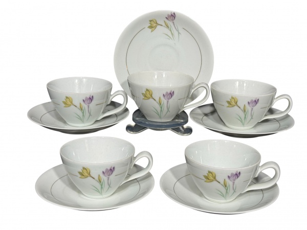 • PORCELANA RENNER, cinco (5) xícaras para chá com seus respectivos confeccionadas em porcelana nacional na tonalidade branca decoradas por flores e folhagens em policromia e filete em ouro, medindo 5,5x11x9cm.