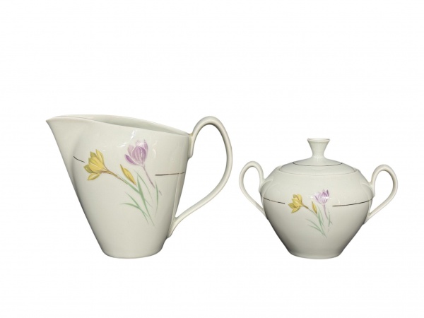 • PORCELANA RENNER, duas (2) peças, sendo: A) 1 leiteira, medindo 14,5x19x9cm e B) 1 açucareiro, medindo 12x16x8cm. confeccionadas em porcelana nacional na tonalidade branca decoradas por flores e folhagens em policromia e filete em ouro.