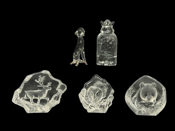 • VIDROS, cinco (5) peças confeccionadas em vidro transparente moldado, representando figuras e relevos de animais, incluindo cervo, coruja (MATS JONASSON), urso (panda) (MATS JONASSON) , guerreiro viking e 1 cachorro (apresenta bicados), maior peça medindo 7,5cm e menor 5cm.