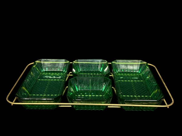 • VIDROS, uma (1) petisqueira com quatro divisórias confeccionadas em vidro na tonalidade verde moldada por sulcos e losangos, apoiada sobre estrutura em metal com pintura dourada, medindo 36x21cm.