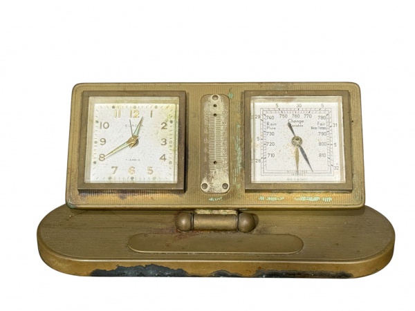 • RELÓGIO, um (1) relógio analógico, termômetro e barômetro, da marca EUROPA, montados em estrutura em metal dourado. Relógio com mostrador quadrado, algarismos arábicos e indicação de 7 jewels; barômetro graduado com indicações climáticas (Rain / Change / Fair), conforme mostrador, ausência do termometro, vendido no estado, não testado e sem garantia de funcionamento, medindo 9,5x18x5,5cm.