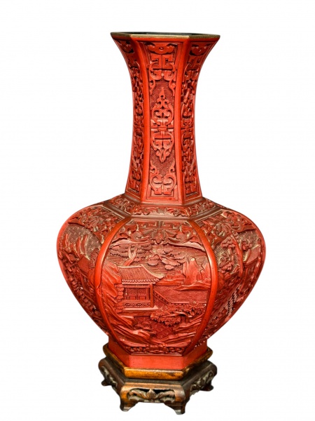 • DIVERSOS, um (1) vaso bojudo e sextavado, confeccionado em laca em tonalidade vermelho cinábrio, ricamente entalhado em relevo com cenas orientais tradicionais, representando paisagem com arquitetura, vegetação e figuras, além de painéis com motivos geométricos e simbólicos no gargalo, medindo 26cm de altura.