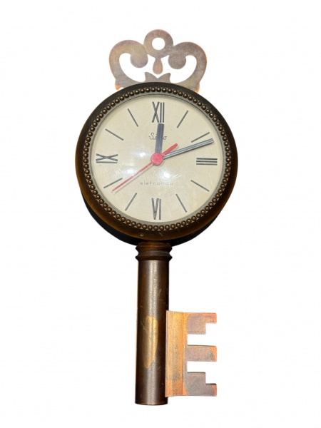 • RELÓGIO, um (1) relógio de parede da manufatura SILCO, modelo ELETRÔNICO, movido a pilha, caixa no feitio de chave confeccionada em plástico rígido e pintura dourada, não testado e sem garantia de funcionamento, medindo 37x15,5cm.