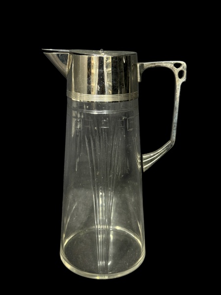 • CRISTAL e METAL PRATEADO, uma (1) jarra estilo art noveau confeccionada em cristal translucido com lapidação de frisos horizontais, palmas e elementos geométricos em baixo relevo com gargalo e alça em metal espessurado a prata, medindo 27cm de altura.
