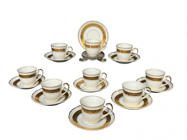 • PORCELANA REAL, nove (9) xícaras para café com seus respectivos pires confeccionados em porcelana nacional na tonalidade branca decorado por espessa faixa em ouro decorado por guirlanda floral com arremates e filetes em douração, medindo 5x7x5,5cm.