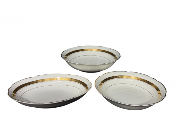 • PORCELANA REAL, três (3) peças, sendo: A) 2 saladeiras, medindo 6x26cm e 5,5x24cm e B) 1 travessa funda, medindo 6x28,5x20,5cm (falhas na douração), confeccionados em porcelana nacional na tonalidade branca decorado por espessa faixa em ouro decorado por guirlanda floral com arremates e filetes em douração.