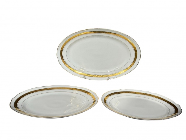 • PORCELANA REAL, três (3) travessas ovais confeccionadas em porcelana nacional na tonalidade branca decorado por espessa faixa em ouro decorado por guirlanda floral com arremates e filetes em douração, medindo 41x27cm / 37x24cm e 33x22cm, 2 menores bicada.