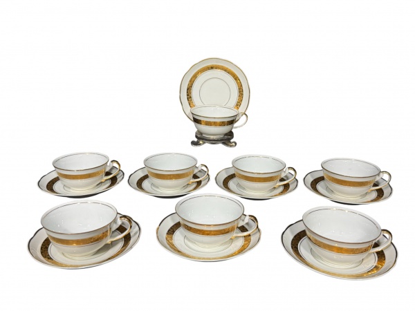 • PORCELANA REAL, oito (8) xícaras para chá com seus respectivos pires confeccionados em porcelana nacional na tonalidade branca decorado por espessa faixa em ouro decorado por guirlanda floral com arremates e filetes em douração, medindo 5x11,5x9cm.