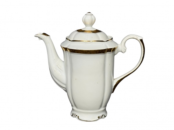 • PORCELANA REAL, um (1) bule para café confeccionado em porcelana nacional na tonalidade branca decorado por espessa faixa em ouro decorado por guirlanda floral com arremates e filetes em douração, medindo 23,5x23,5x10cm.
