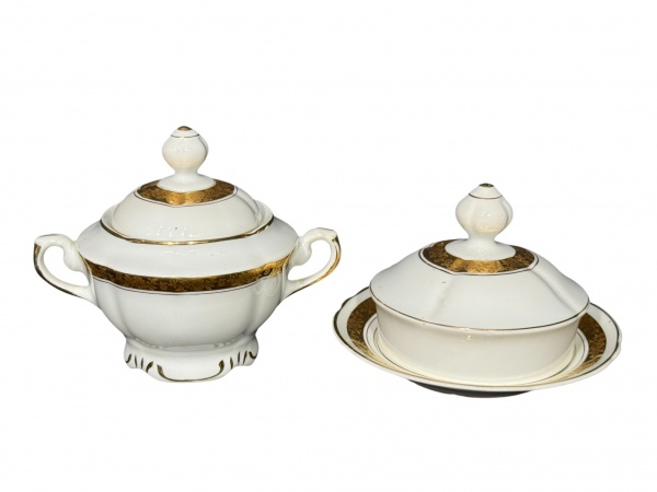 • PORCELANA REAL, duas (2) peças, sendo: A) 1 açucareiro, medindo 12x15x8cm e B) 1 manteigueira, medindo 10x15x8cm, confeccionados em porcelana nacional na tonalidade branca decorado por espessa faixa em ouro decorado por guirlanda floral com arremates e filetes em douração.