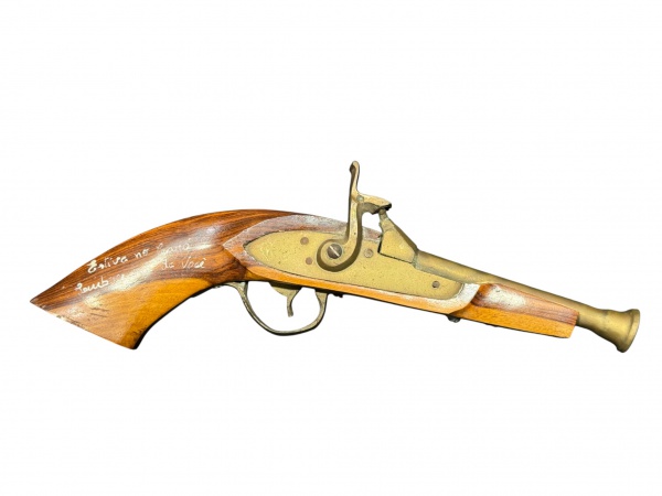 • MILITARIA, uma (1) réplica de garrucha confeccionada em madeira e bronze, inscrição de souvenir do Ceará, em excelente estado de conservação, medindo 29cm de comprimento.