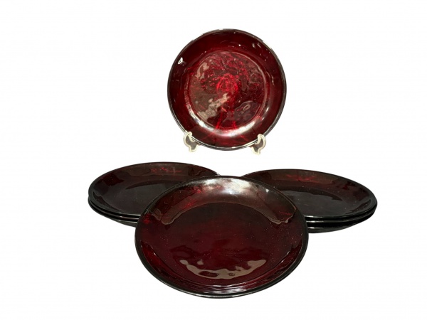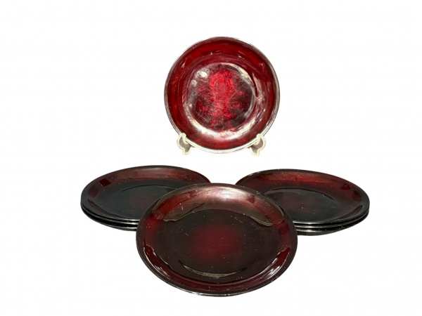 • VIDROS, oito (8) pratos para sobremesa confeccionados em vidro com textura granulada na tonalidade vermelha, medindo 19,5cm.