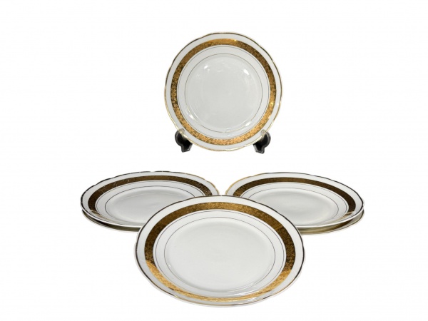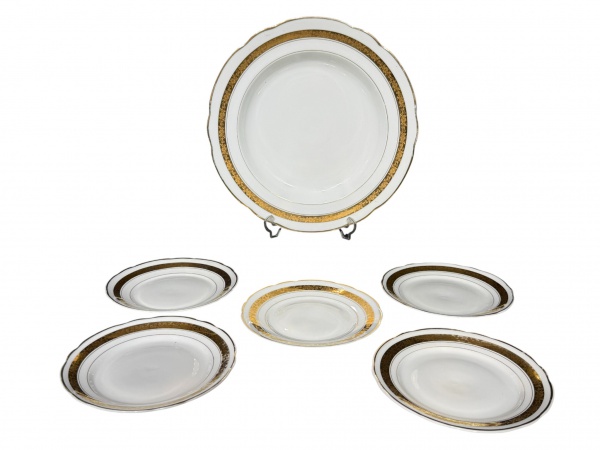 • PORCELANA REAL, seis (6) peças, sendo: A) 1 prato para bolo, medindo 33cm (falhas na douração) e B) 6 pratos para sobremesa (alguns com leves falhas na douração), medindo 18cm, confeccionados em porcelana nacional na tonalidade branca decorado por espessa faixa em ouro decorado por guirlanda floral com arremates e filetes em douração.