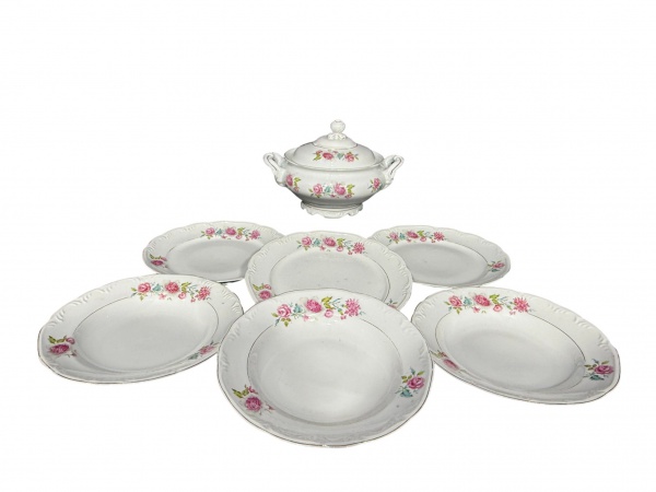 • PORCELANA SCHMIDT, lote com sete (7) peças confeccionadas em porcelana nacional na tonalidade branca com pintura de flores e folhagens em policromia e filetes em ouro, sendo: A) 1 terrina, medindo 17x27x19cm, B) 3 pratos rasos, medindo 24cm, 1 bicado e C) 3 pratos fundos, medindo 23cm, 1 bicado.