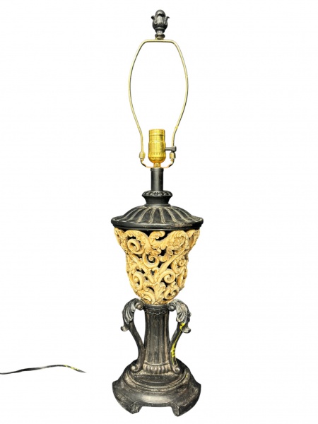• ABAJUR, um (1) abajur para uma lâmpada confeccionado em resina com rica moldagem vegetalista emvazados, base no feitio de coluna ladeada por arabescos esmaltados na tonalidade preta, acompanha suporte para cúpula na parte superior, medindo 52cm de altura. (sem a parte de cima);