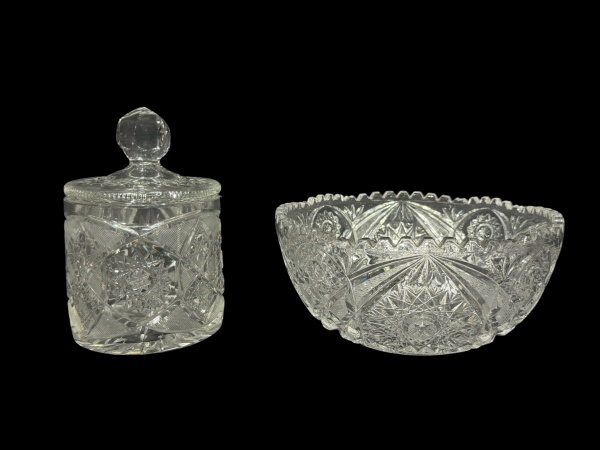 • CRISTAIS, lote com duas (2) peças confeccionadas em cristal translucido, sendo: A) 1 fruteira com rica lapidação de estrelas, palmas, caneluras e pingos de diamante em baixo relevo com borda dentada, medindo 10x22cm e B) 1 biscoiteira confeccionada em cristal translucido com rica lapidação em pingos de diamante, geométricos, estrelas e caneluras em baixo relevo, medindo 18x11,5cm, imperceptíveis bicados na borda.