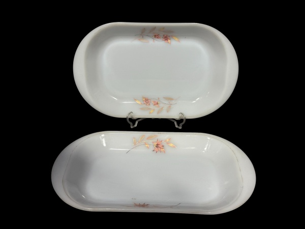 • COLOREX (Em 1961, a Vidraria Santa Marina lançou um conjunto de louças), duas (2) travessas ovais confeccionadas em vidro opalinado com pintura de flores e folhagens em policromia, medindo 36x21cm e 30,5x16cm.