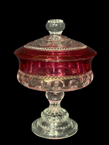 • VIDRO, uma (1) compoteira confeccionada em vidro prensado translucido com espessa faixa pintada na tonalidade vinho, moldada por frisos ondulados e esferas em baixo relevo, medindo 19x12,5cm.