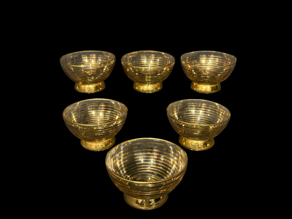 • VIDROS, seis (6) taças para sobremesa confeccionados em vidro translucido ao gosto anos 50 decorada por filetes em ouro, medindo 6x10cm.