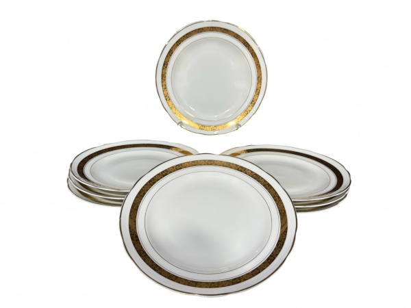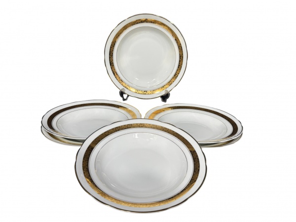 • PORCELANA REAL, seis (6) pratos fundos confeccionados em porcelana nacional na tonalidade branca decorado por espessa faixa em ouro decorado por guirlanda floral com arremates e filetes em douração, medindo 23,5cm.
