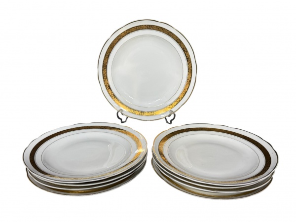 • PORCELANA REAL, nove (9) pratos rasos confeccionados em porcelana nacional na tonalidade branca decorado por espessa faixa em ouro decorado por guirlanda floral com arremates e filetes em douração, medindo 25cm. 2 bicados.