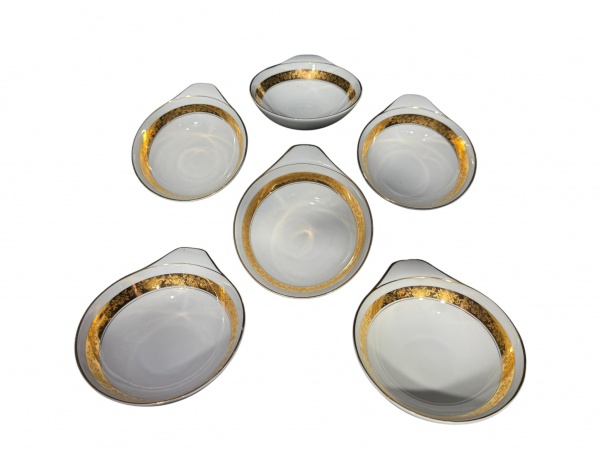 • PORCELANA REAL, seis (6) bowls confeccionados em porcelana nacional na tonalidade branca decorado por espessa faixa em ouro decorado por guirlanda floral com arremates e filetes em douração, medindo 4x16x14cm.