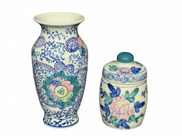 • PORCELANAS, lote com duas (2) peças confeccionadas em porcelana na tonalidade branca, ambas com pintura floral em rica policromia ao gosto oriental, sendo 1 pequeno potiche, medindo 10x6cm e 1 vaso balauste, medindo 15x7cm.