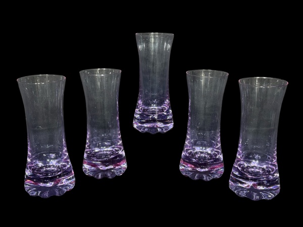• VIDROS, cinco (5) copos para água confeccionados em vidro prensado na tonalidade roxa com base moldada em gomos, 1 apresenta bicado na borda, medindo 15,5x6cm.