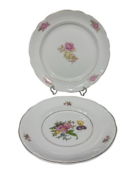 • PORCELANAS, lote com duas (2) peças confeccionadas em porcelana nacional na tonalidade branca, sendo: A) SCHMIDT, 1 prato decorativo com elementos vegetalistas em relevo na pasta, pintura floral em policromia e filete em ouro na borda, medindo 28cm e B) REAL, 1 prato para bolo com pintura floiral em policromia e filetes em ouro, medindo 32cm.