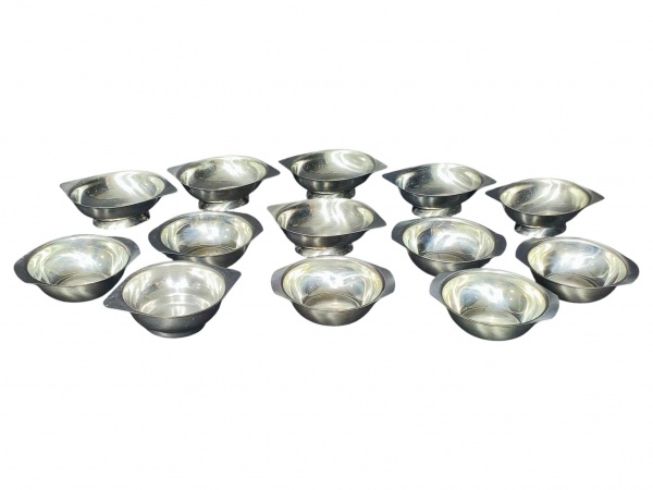 • AÇO INOX - Lote com 13 recipientes para sobremesa confeccionados em aço Inox sendo seis da manufatura Gazola , medida da peça maior : 4 x 12 x 9 cm e medida da peça maior : 4 x 12 x 8 cm