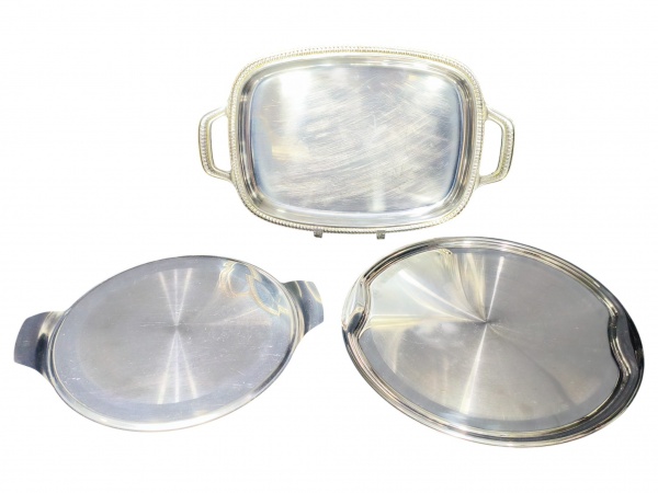 • METAL PRATEADO INOX, três (3) peças confeccionadas em aço inox, sendo: A) 1 bandeja retangular da manufatura BELINNI, medindo 43x26cm e B) 2 bandejas redondas, sendo 1 da manufatura BACKER, medindo 36,5x30cm e 36cm.