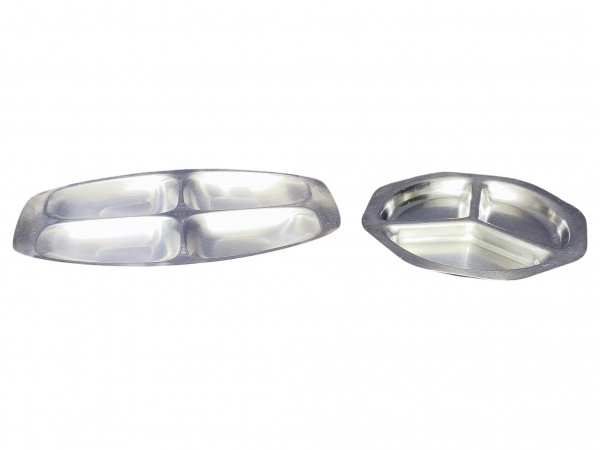 • METAL PRATEADO INOX, duas (2) petisqueiras confeccionadas em aço inox, sendo: A) 1 de 4 divisórias da manufatura BELINNI, medindo 37x24cm e B) 1 de 3 divisórias da manufatura BATHORYSP, medindo 25x25cm.
