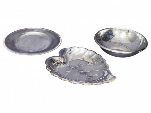 • METAL PRATEADO INOX, lote com três (3) peças confeccionadas em aço inox, sendo: A) 1 fruteira no feitio de folha da manufatura MERIDIONAL, medindo 25x22cm, B) 1 travessa redonda da manufatura MERIDIONAL, medindo 24,5cm e C) 1 saladeira da manufatura FRACALANZA, medindo 6x21cm.