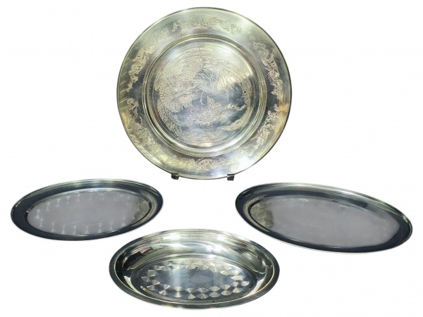 • METAL PRATEADO INOX, quatro (4) peças confeccionadas em aço inox, sendo: A) 1 prato decorativo com rico cinzelado floral com pássaro, medindo 31cm de diâmetro e B) 3 travessas ovais com fundo decorado por esferas, medindo 29x17,5cm e 25x17cm.