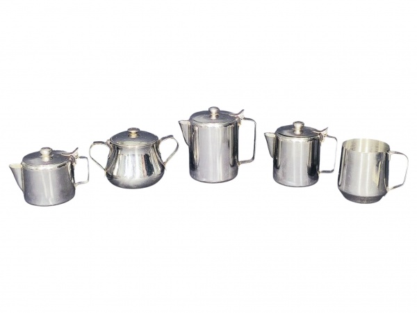 • METAL PRATEADO INOX, lote com cinco (5) peças confeccionadas em aço inox, sendo: A) parte de serviço com três peças: 1 bule para chá, 1 bule para café e 1 leiteira, maior peça medindo 13x14,5x9cm e menor 8x12x8cm, B) 1 açucareiro da manufatura MERIDIONAL, medindo 10x16x8cm e C) 1 caneca, medindo 9x10x7,5cm.