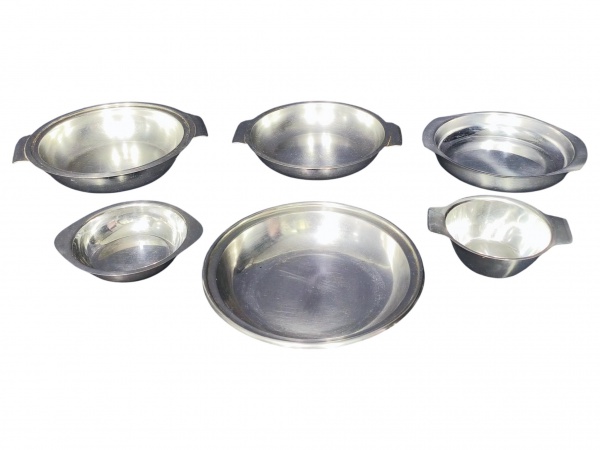 • METAL PRATEADO INOX, lote com seis (6) peças confeccionadas em aço inox, sendo: A) 3 pratos dito PANELINHA, B) 2 bowls e C) 1 saladeira. Maior peça medindo 5x27x13cm e menor peça 5x16x13cm.