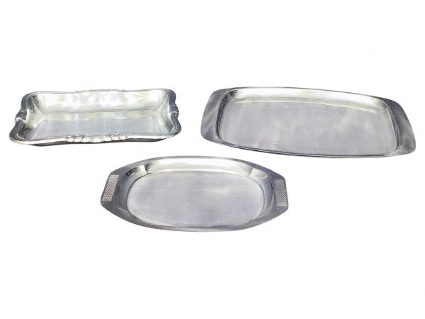 • METAL PRATEADO INOX, três (3) peças confeccionadas em aço inox, sendo: A) 2 bandejas ovais, medindo 26x19cme 36x25,5cm e B) 1 pãozeira com borda em arabescos da manufatura WOLFF, medindo 27,5x20cm.