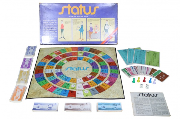 • COLECIONISMO, um (1) STATUS: O JOGO DA ASCENSÃO SOCIAL (ESTRELA, BRASIL), jogo de tabuleiro brasileiro que marcou gerações, foi lançado pela Estrela nos anos 1970/80 e se tornou um verdadeiro ícone cultural, satirizando de forma divertida a busca por riqueza, prestígio e posição social. O jogo simula a trajetória do jogador em direção ao sucesso, passando por profissões, bens, eventos e desafios financeiros, em uma mecânica que mistura estratégia, sorte e crítica social  característica que o tornou tão popular, peças destacadas, marcas do tempo, vendidas no estado da foto.