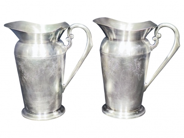 • METAL PRATEADO, duas (2) jarras refresqueiras confeccionadas em metal espessurado a prata da manufatura EBERLE com cinzelado de elementos vegetalistas, 1 apresenta mossa na base, medindo 22x20x13cm.