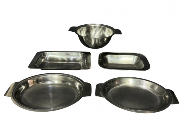 • METAL INOX - Lote com (4) travessas fundas e (1) tigela confeccionadas em Inox , tamanhos , modelos e decorações distintas , medida da peça maior : 7,5 x 27 x 21 cm / medida da peça menor : 4 x 22 x 16 cm .